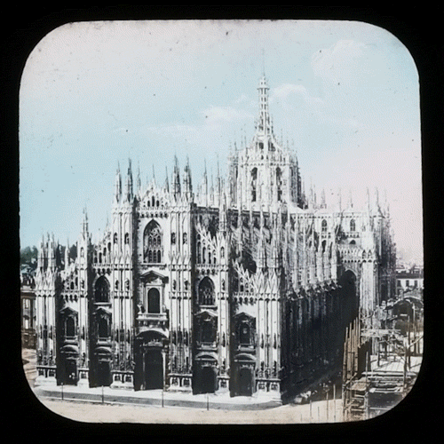 ‘Milan cathedral’ day, night, and illuminations. 3 slide magic lantern dissolve set, hand coloured. measuring 7” x 4”.