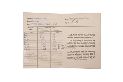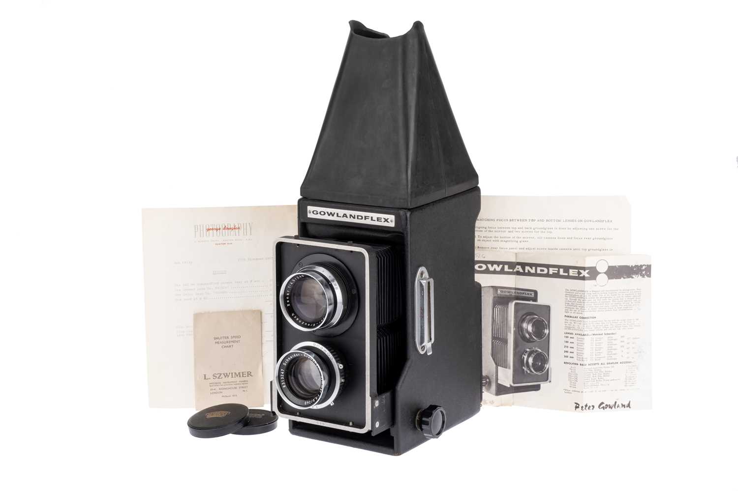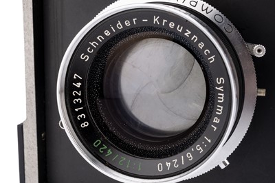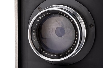 black, with Schneider Symmar f/5.6 240mm taking lens, chrome, serial no. 8313247, with Schneider Xenar f/4.0 240mm viewing lens, chrome, serial no. 7562085, body, G-VG, with rotating 4x5 back, lenses, G-VG, some light internal haze, together with a range of documentation