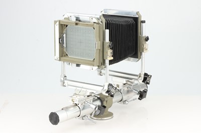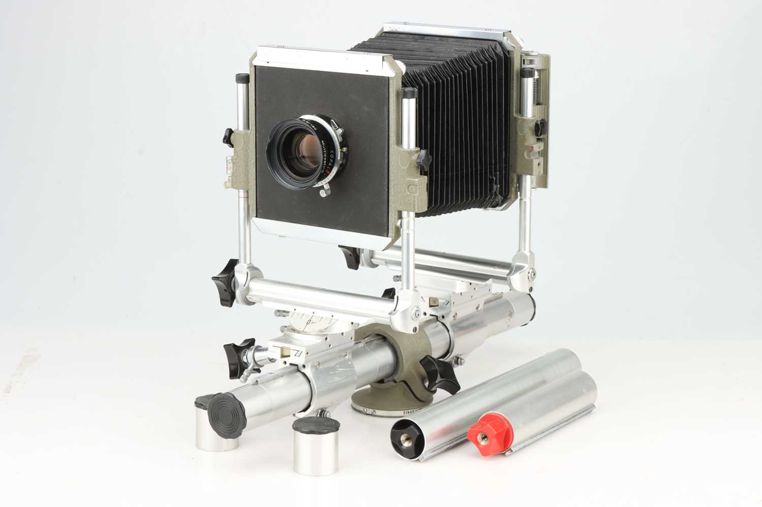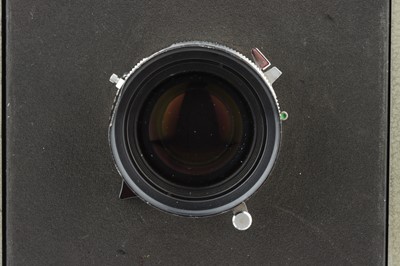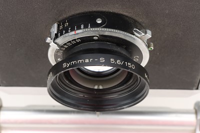 with Schneider Symmar-S f/5.6 150mm lens, body, G, lens, G, speeds inaccurate and ding to filter thread, complete with wide angle bag bellows, extension rails and polaroid back, in maker's case