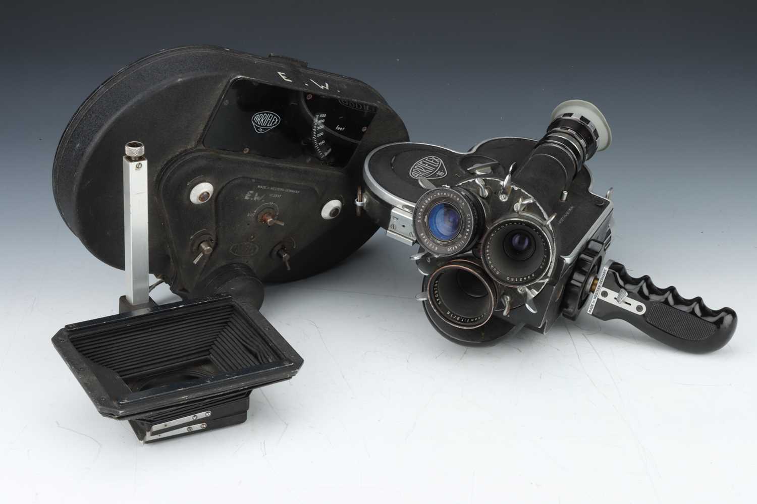 with Schneider Cinegon f/1.8 10mm, Schneider Xenon f2 35mm and Schneider Xenon f/1.9 16mm lenses, body, G, powers up and working but battery not holding charge, lenses overall, G, some internal haze and marks, complete with 400ft magazine