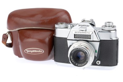 silver, 239373, body VG, shutter hesitant but does complete the cycle, with a Color-Skopar X f/2.8 50mm lens, barrel G, optics G, with leather ERC, G.