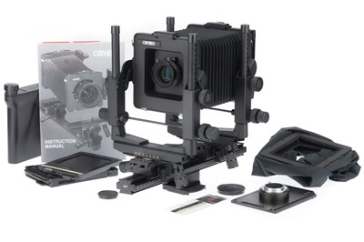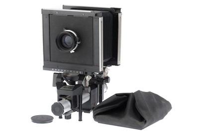 black, serial number 26050, bellows G, controls operate, focusing screen present, with a Schneider-Kreuznach Symmar-S f/5.6 150mm lens, barrel VG, ... read more