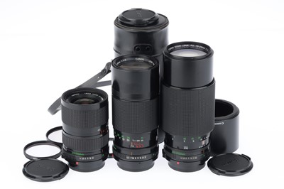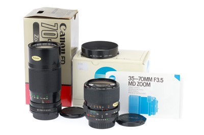 comprising an FD f/4 35-70mm, barrel VG, optics G, woth caps, an FD f/4.5 70-150mm, barrel VG, optics G, with caps and case, and an FD f/4 70-210mm, ... read more