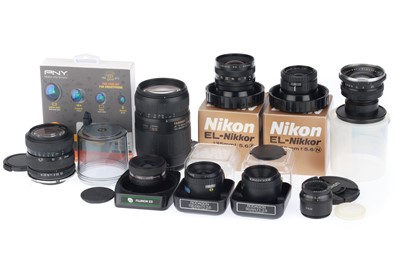 to include a Tamron 70-300 AF lens, a Tamron 28-70mm zoom, Nikon enlarger lenses, and others by Rodenstock, Schneider, and other items.