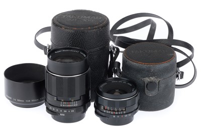 comprising a Super-Multi-Coated Takumar f/2.8 105mm, black, barrel VG, optics VG, and a Super-Multi-Coated Takumar f/3.5 35mm, black, barrel VG, ... read more